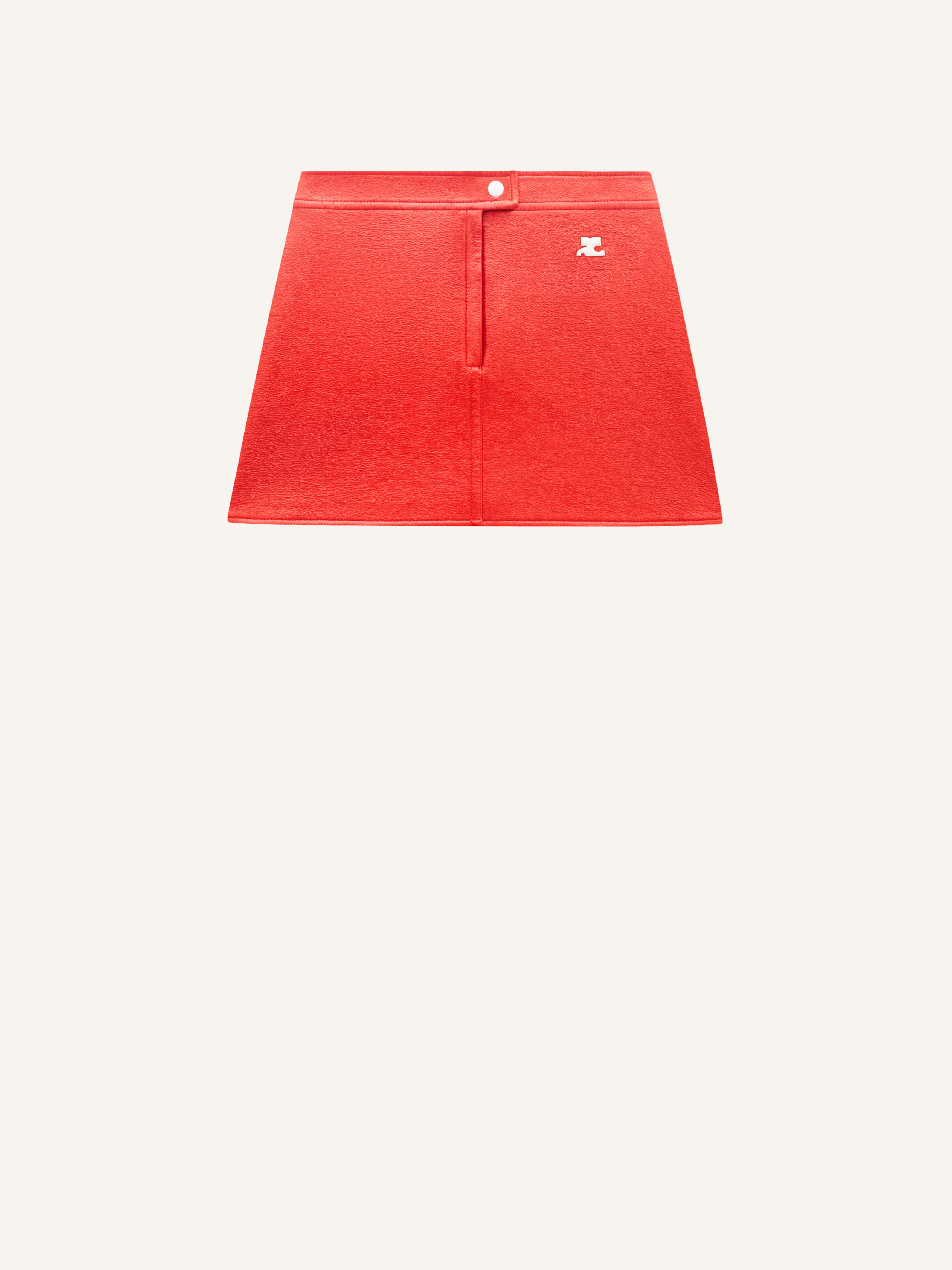 Vinyl miniskirt with white embroidered AC logo on the front. Closure fly style Courrèges with zip and white lacquered pressure. Darts in the back. Lined model. DETAILS Composition: 88% Cotton 10% Polyurethane 2% Elasthane Lining :100% Cupro Country of manufacture: Serbia Color : Heritage Red Item Code :PERCJU001VY00143020