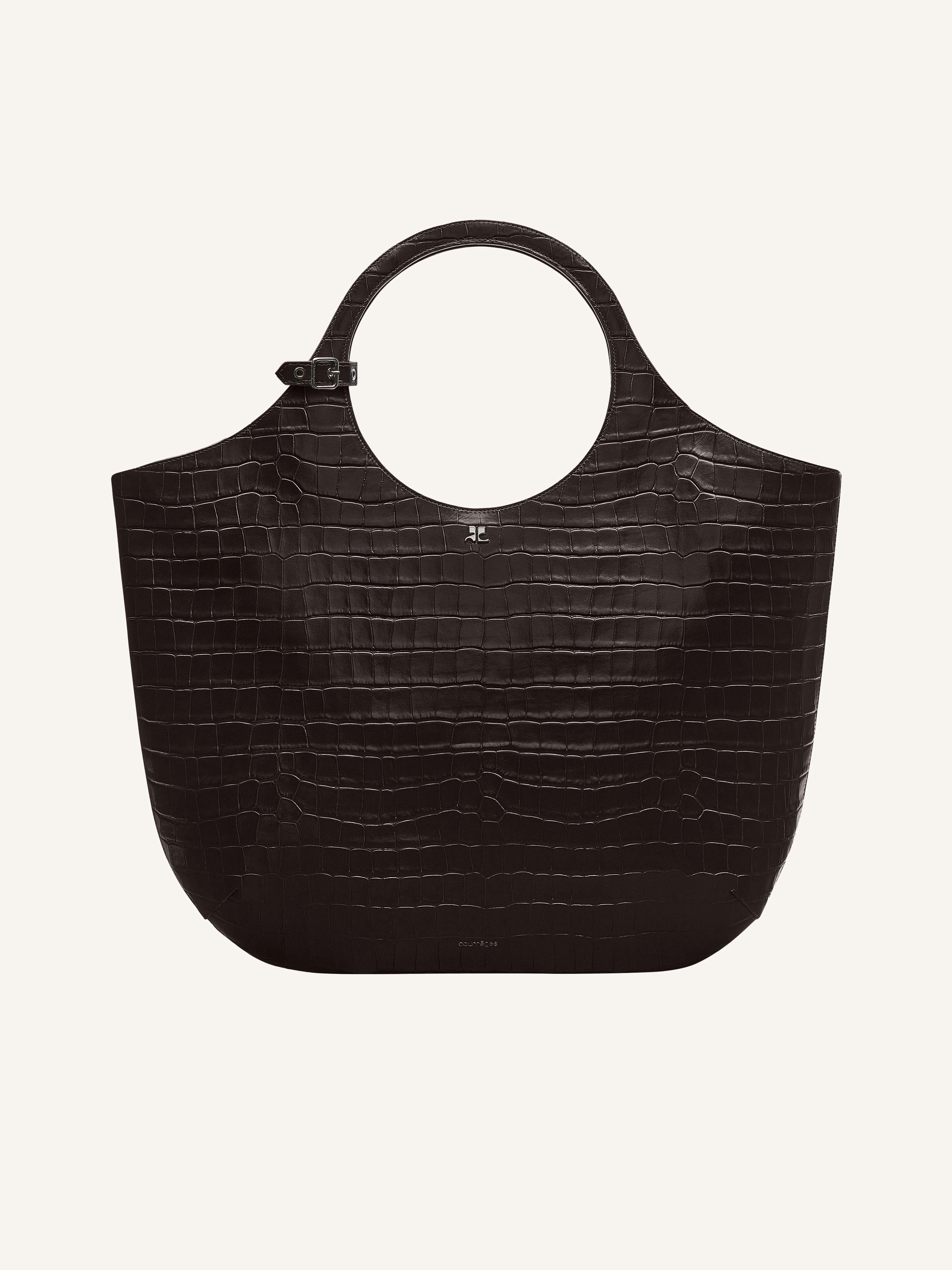 Large Croco stamped Holy bag with magnetic closure and metallic AC logo. Embossed Courreges logo on front. Buckle detail on handles. One zipped pocket and two patch pockets inside. Adjustable and removable shoulder strap. Height: 53 cm Width: 48 cm DETAILS Composition: 100% embossed cow leather Country of Manufacture: IT SKU: 224GSA103CR00601146 Color: Bark