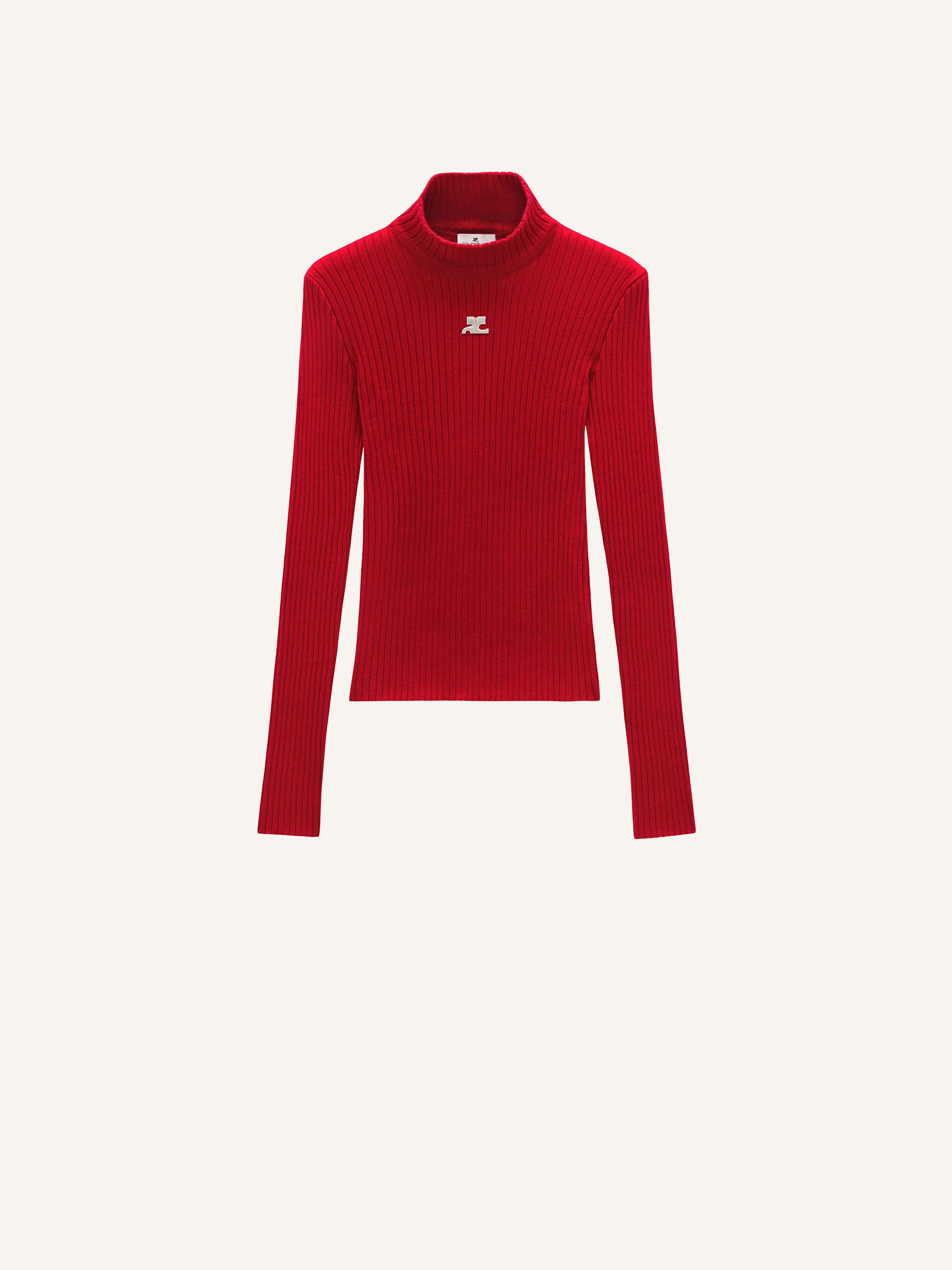 The ribbed knit is a timeless Courrèges piece. It is declined here in a long sleeves version with a high collar and enhanced on the front with our embroidered white AC logo. DETAILS Composition: 70% Viscose 30% Polyester Country of manufacture: Bulgaria Color : Red Item Code :PERMPU022FI00014034