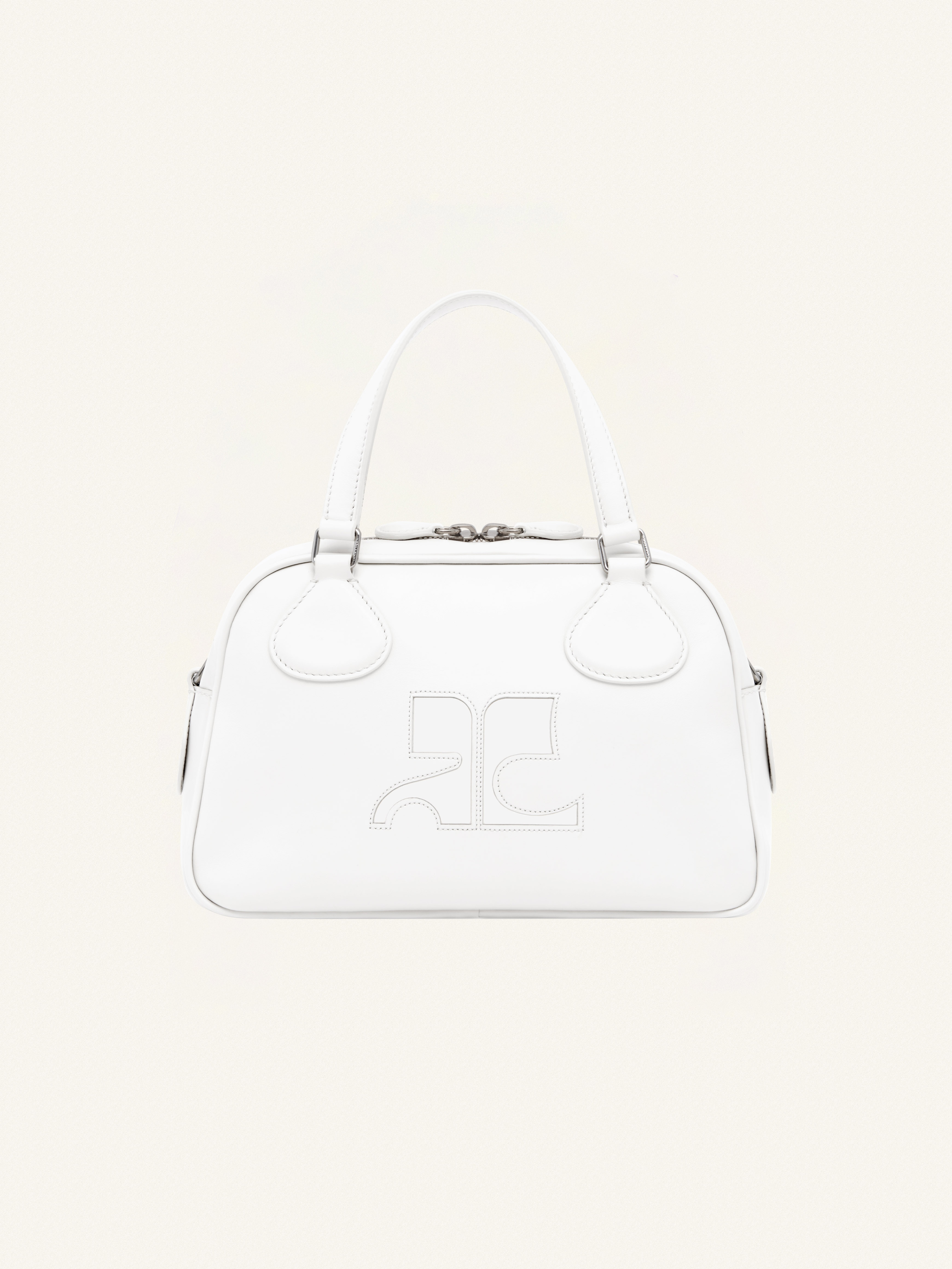 Reedition leather Bowling bag with AC logo inlaid on front. Metal zipper closure. Short handles with removable and adjustable shoulder strap. Inside zipped pocket. Length: 25 cm Height: 15.5 cm Width: 12 cm DETAILS Composition : 100% VACHETTE 100% COTON 55% POLYAMIDE/NYLON 25% POLYURETHANE 20% ELASTHANE Color : Heritage white Item code : PERGSA062CR00450001