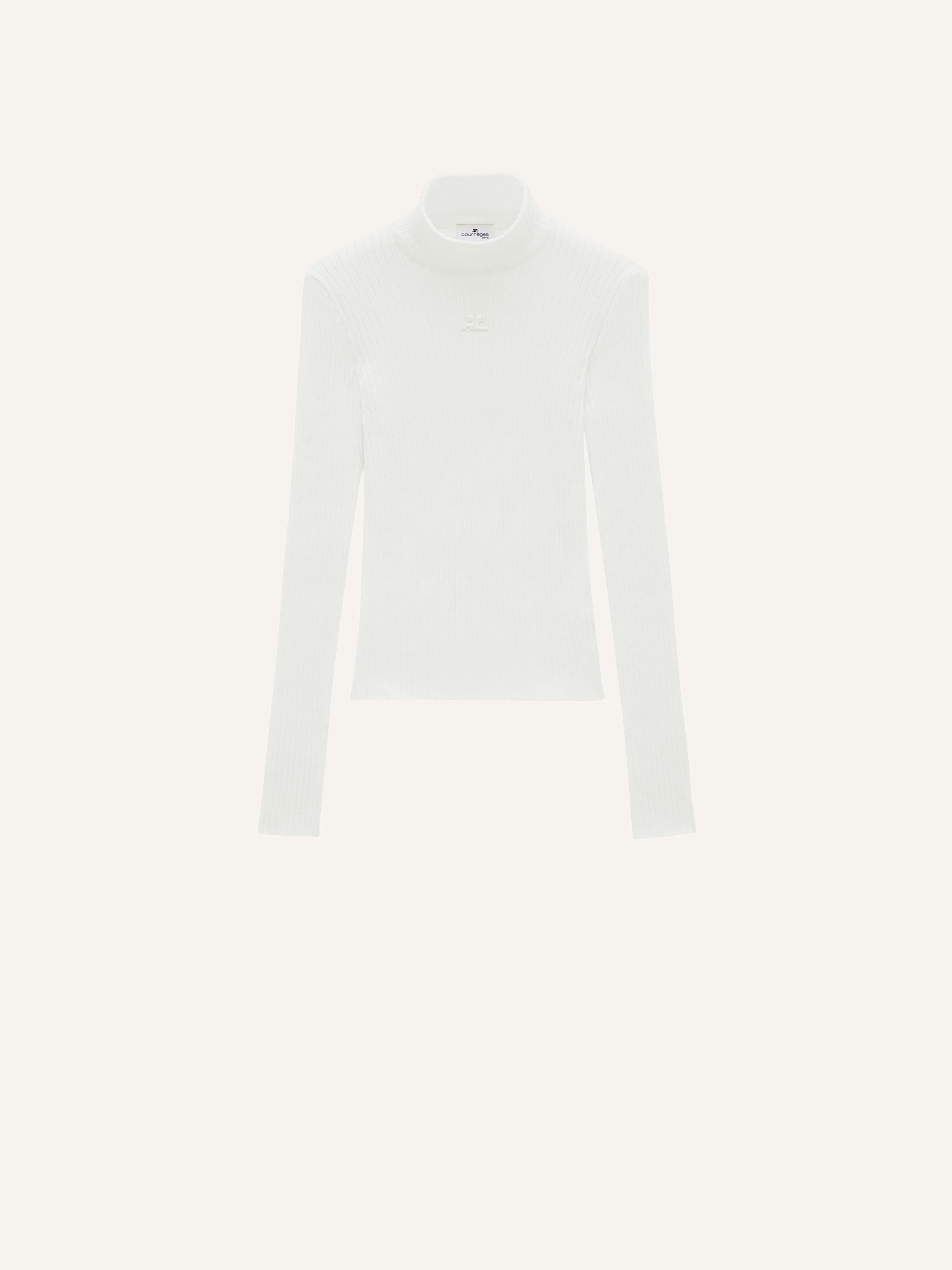The ribbed knit is a timeless Courrèges piece. It is declined here in a long sleeves version with a high collar and enhanced on the front with our embroidered white AC logo. DETAILS Composition: 70% Viscose 30% Polyester Country of manufacture: Bulgaria Color : Heritage White Item Code :PERMPU022FI00010001