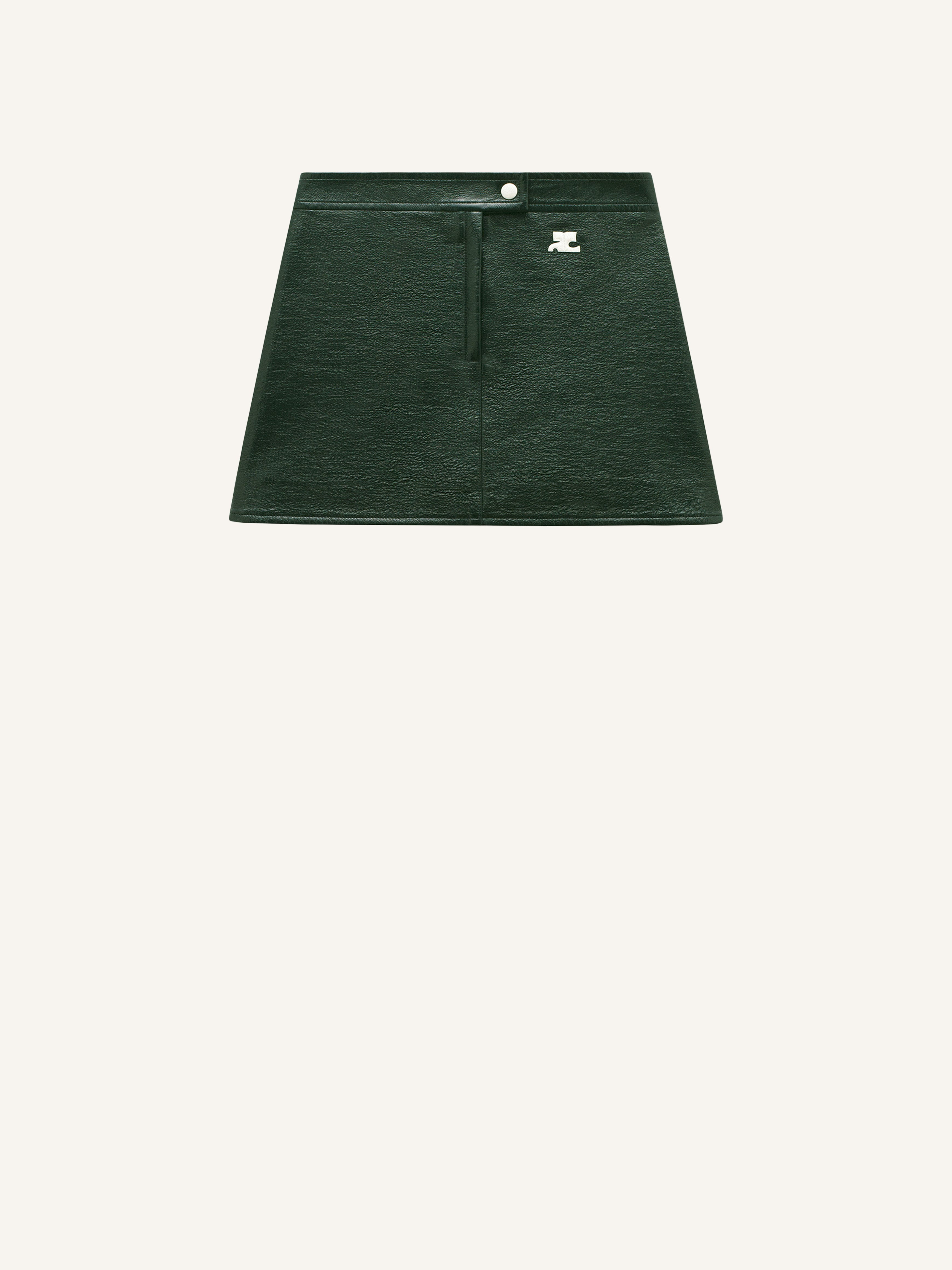 Vinyl miniskirt with white embroidered AC logo on the front. Closure fly style Courrèges with zip and white lacquered pressure. Darts in the back. Lined model. DETAILS Composition : 88% COTON 10% POLYURETHANE 2% ELASTHANE 100% CUPRO Color : Dark green Item code : PERCJU001VY00148081