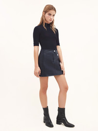 Vinyl miniskirt with white embroidered AC logo on the front. Closure fly style Courrèges with zip and white lacquered pressure. Darts in the back. Lined model. DETAILS Composition : 88% COTON 10% POLYURETHANE 2% ELASTHANE 100% CUPRO Color : Navy Item code : PERCJU001VY00147075