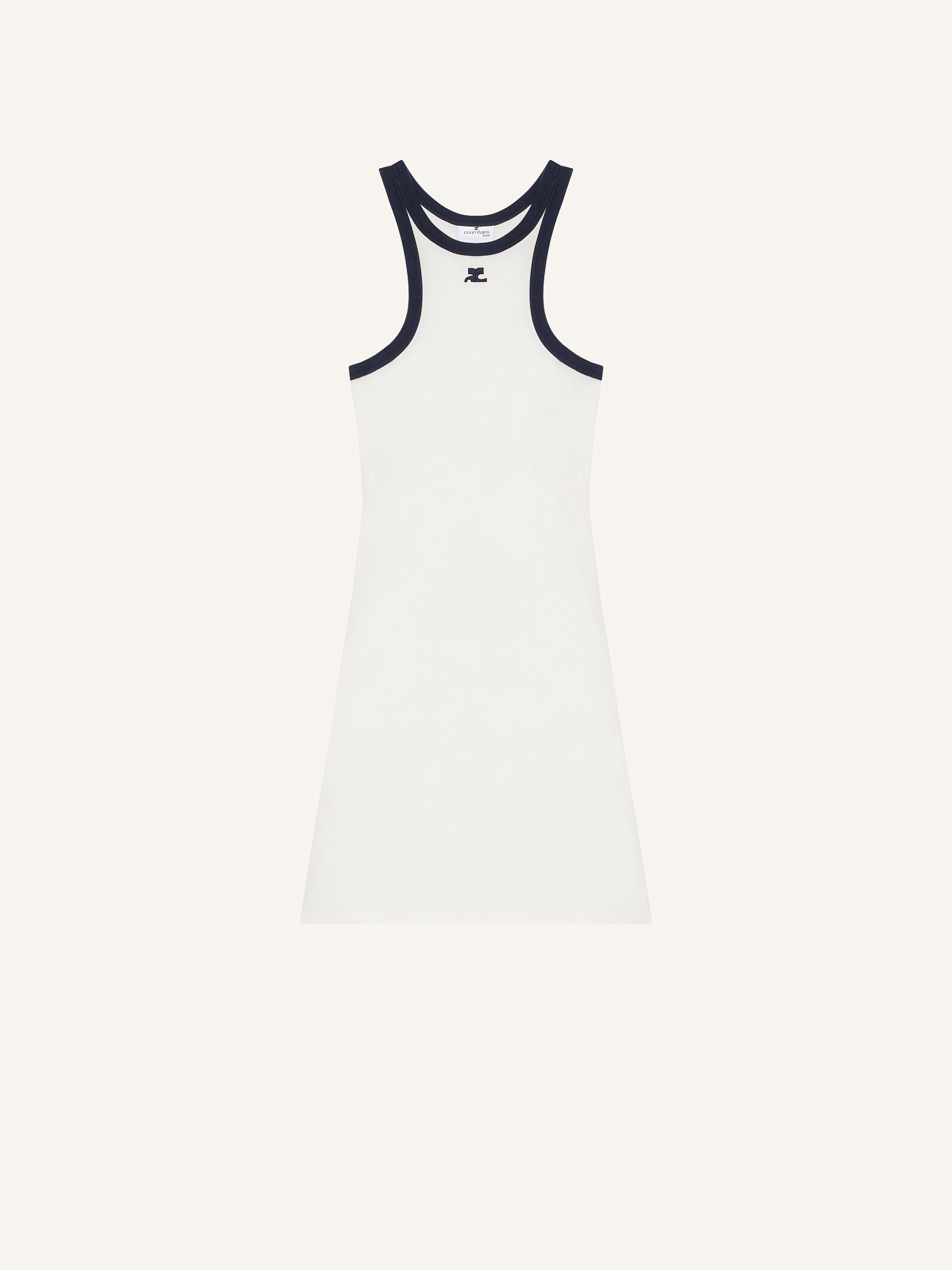 Sleeveless contrast A-line short dress with AC logo under neckline. The model is 1.78m tall and wears a size S. DETAILS Composition: 100% cotton Country of Manufacture: PT SKU: 125JRO577JS02030083 Color: Heritage White / Navy