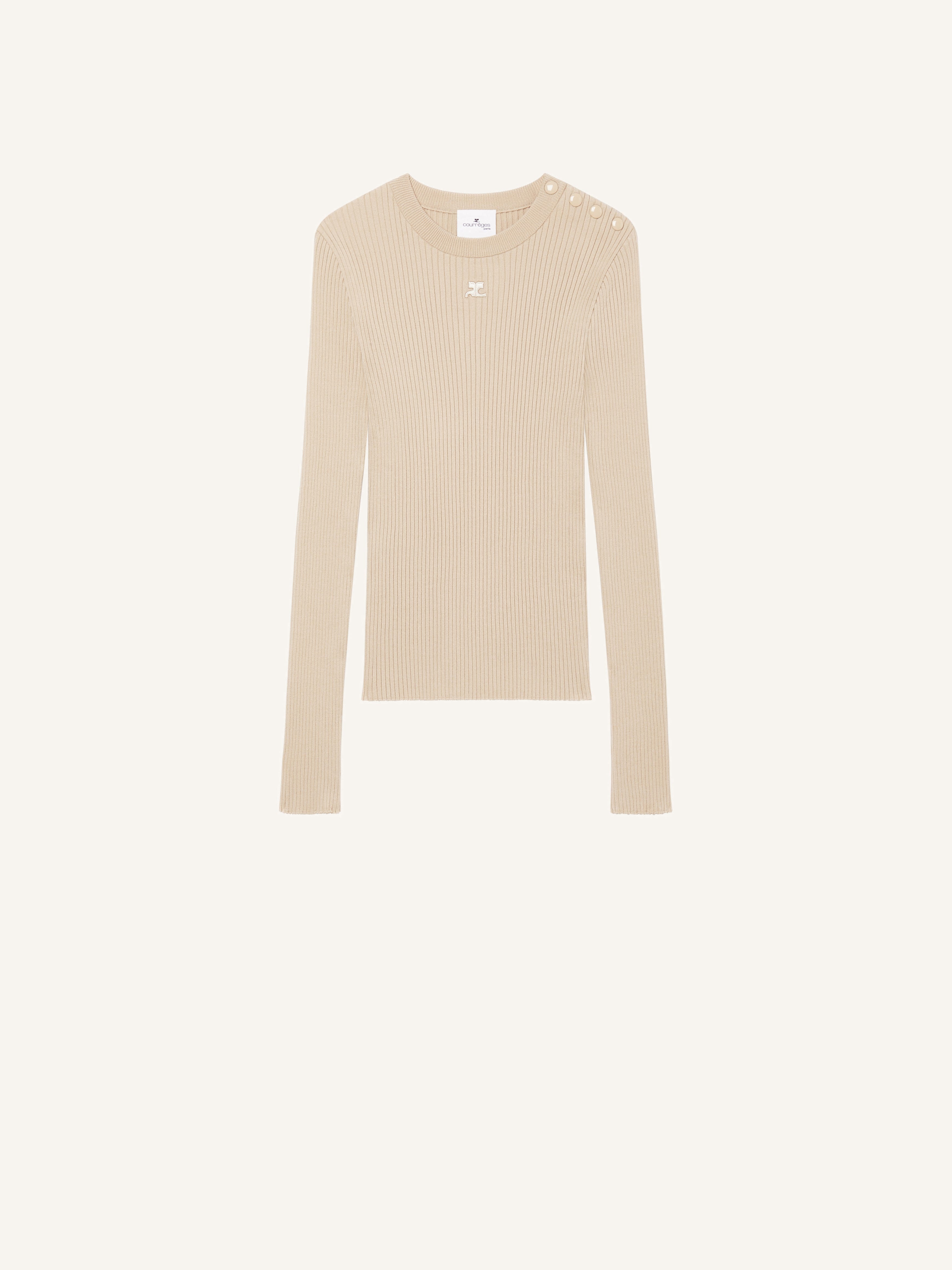 Long-sleeved fitted rib knit sweater with shoulders snaps and AC logo below neckline. The model is 1.75m tall and wears a size S. DETAILS Composition: 70% viscose, 30% polyester Country of Manufacture: BG SKU: VESMPU187FI00011054 Color: Cappuccino