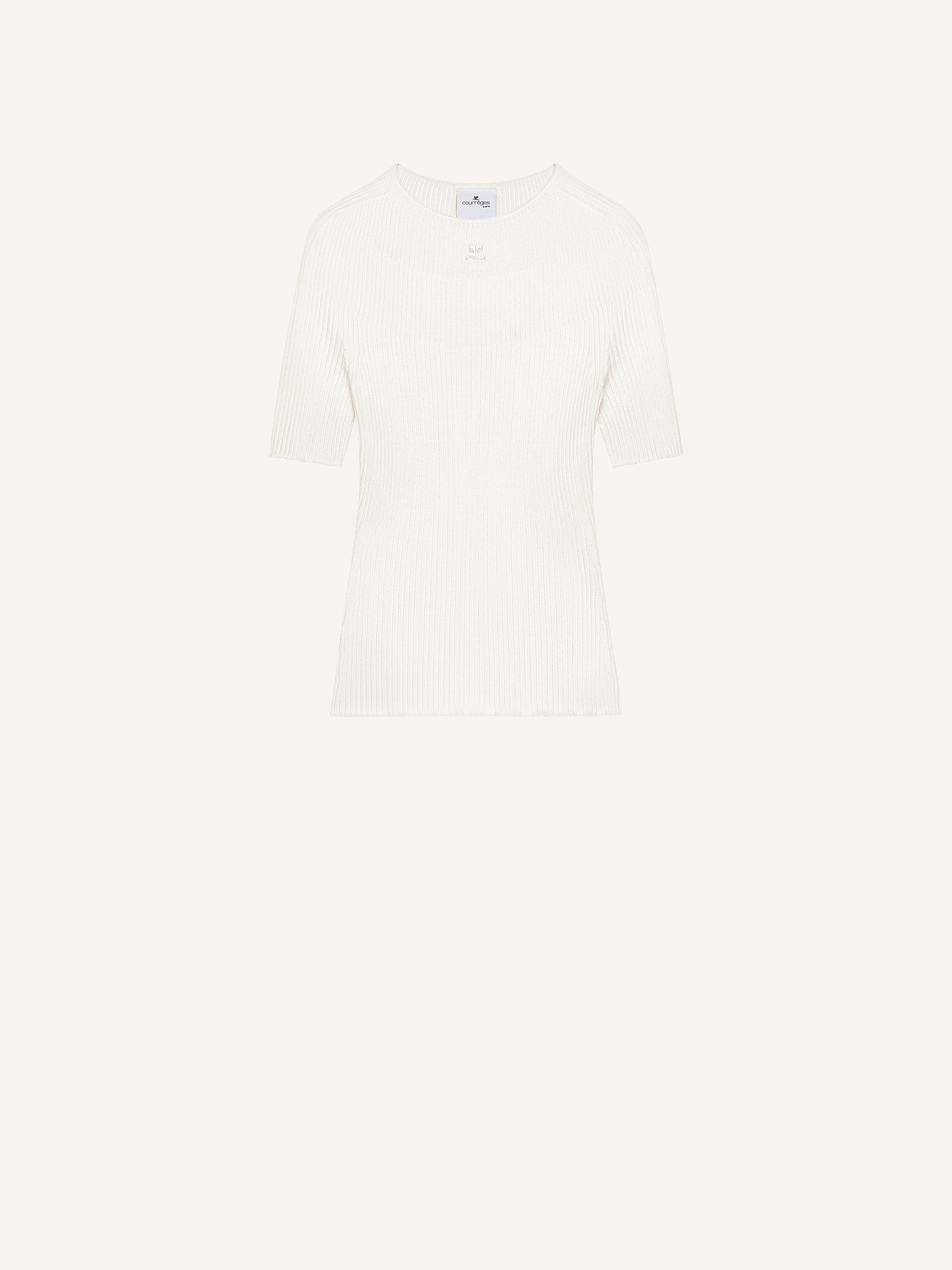Short sleeved seamless knit sweater with a solar ribbed detail and AC logo below neckline. The model is 1.80m tall and wears a size S. DETAILS Composition: 80% cotton , 20% merino wool Country of Manufacture: IT SKU: 125MPU130FI00490001 Color: Heritage White