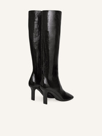 Square-toe vinyl boots. Knee-high with zip closure, lacquered heel with Courreges logo. Embossed Courreges logo on the side. DETAILS Composition: 88% cotton, 10% polyurethane, 2% elastane Country of Manufacture: IT SKU: 425SBT065VY00149999 Color: Black