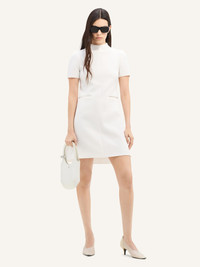 Trapeze mini dress with high collar and AC logo on side. Short sleeves and two front welt pockets. The model is 1.76m tall and wears a size 36. DETAILS Composition: 83% polyester, 17% acetate Country of Manufacture: RS SKU: VESCRO443PL00070001 Color: Heritage White