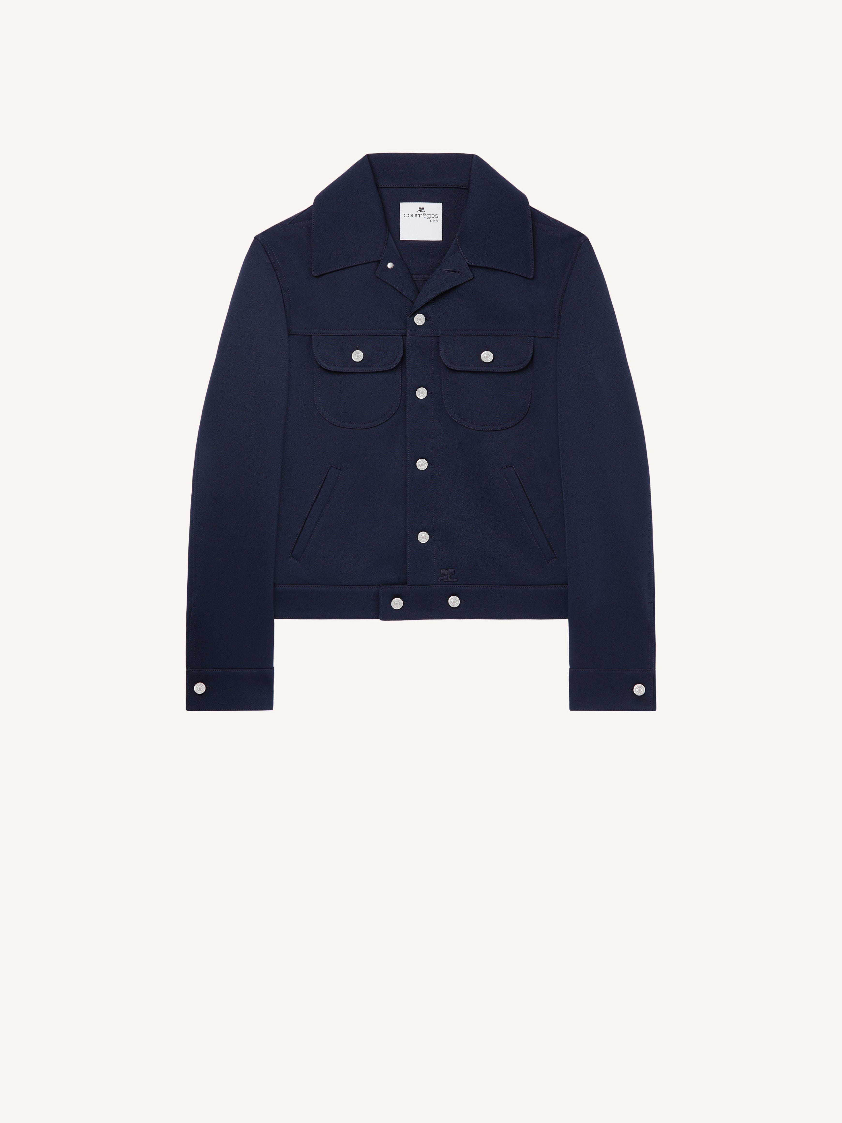 Long-sleeved signature twill Trucker jacket with button closure and AC logo at bottom. Front patch and side pockets. The model is 1.85m tall and wears a size 48. DETAILS Composition: 83% polyester, 17% acetate Country of Manufacture: SK SKU: VESCBL024PL00077075 Color: Navy