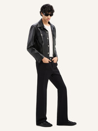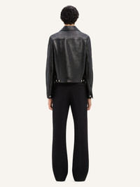 Long-sleeved signature vinyl Trucker jacket with button closure and AC logo at bottom. Front patch and side pockets. The model is 1.85m tall and wears a size 48. DETAILS Composition: 88% cotton, 10% polyurethane, 2% elastane Country of Manufacture: SK SKU: VESCBL063VY00149999 Color: Black