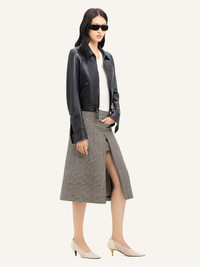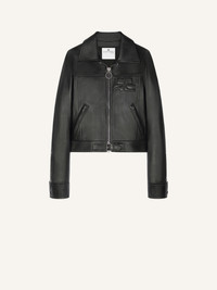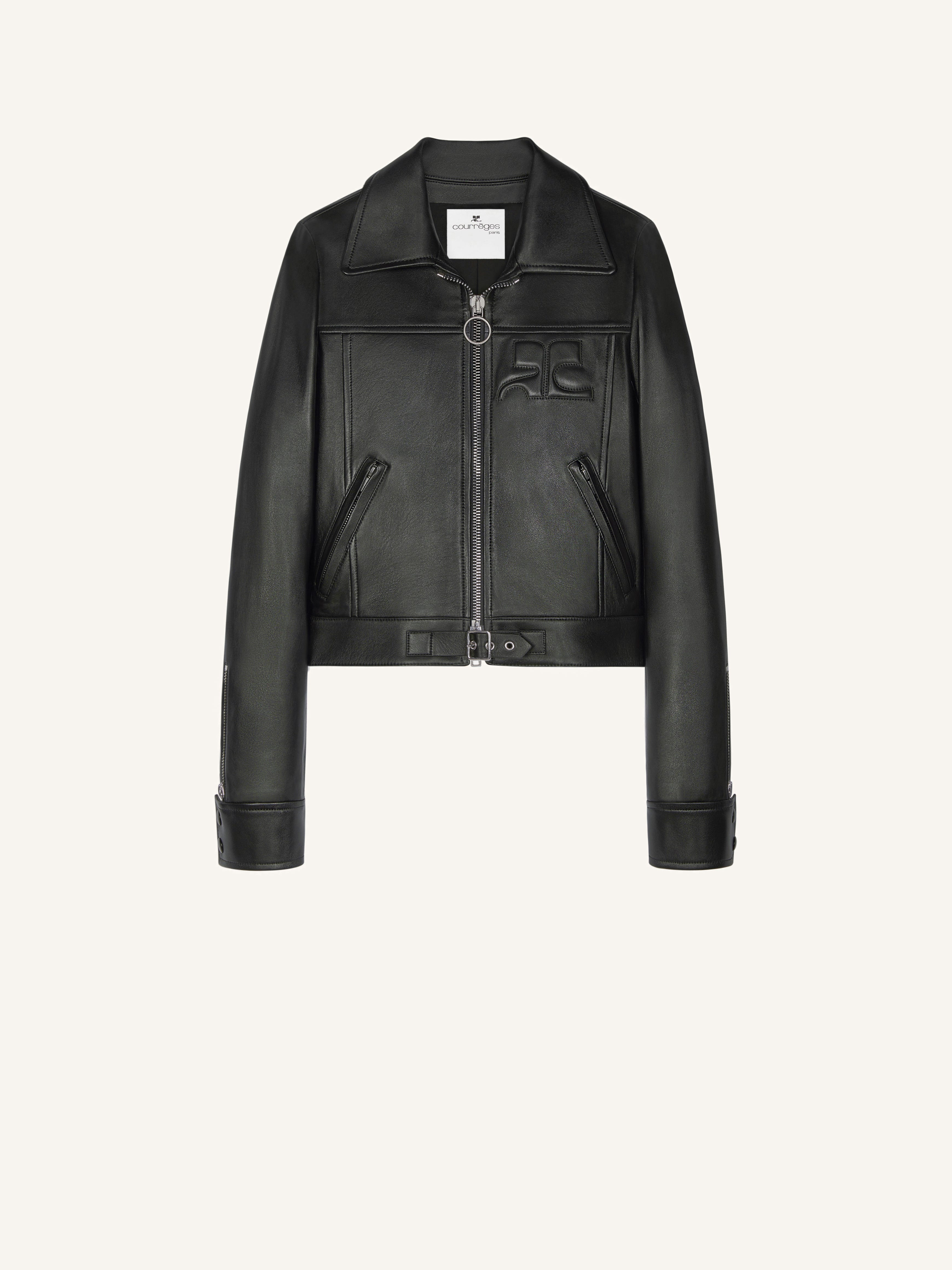 Straight leather jacket with long sleeves and zipped pockets. AC logo on chest and waist strap. The model is 1.78m tall and wears a size 36. DETAILS Composition: 100% lamb skin Country of Manufacture: TR SKU: VESLBL149CV00059999 Color: Black