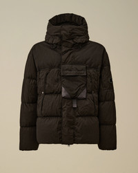 Hooded down jacket crafted in Eco-Chrome R Mixed, the evolution of Chrome-R using ECONYL®, a 100% regenerated nylon. The jacket features C.P. Company’s iconic Lens, a hidden two-way full zip fastening with a flap snap closure, and chest and side snap pockets. Mixed with Twill nylon taslan. Garment dyed with anti-drop treatment. Regular fit. - Adjustable hood - Hidden two-way full zip fastening with flap snap closure - Chest flap snap pocket - Side snap pockets - Lens detail - Ribbed cuffs - Adjustable drawstring hem - Garment dyed - Mixed with twill nylon taslan - Regular fit CARE & COMPOSITION Care - Wash max 30°C - Mild process - Do not bleach - Do not tumble dry - Ironing maximum temperature 110°C - without steam - Do not dry clean - Line dry - Wash separately - Reshape when damp - Remove detachable accessories before washing Composition - External fabric: 100% Polyamide / Nylon - Lining: 100% Polyamide / Nylon - Secondary fabric: 100% Polyamide / Nylon - Padding (Feather): [256gr. - 90% ] 90% Grey duck down, 10% Duck feather SIZE & FITTING - Fits true to size, take your normal size - Model is 186 cm-6' 1" / 98-103 cm chest and is wearing a size L PRODUCT PASSPORT PRODUCT - Weaving: Italy - Dyeing: Italy - Confection: Bulgaria - Product contains at least 40% of recycled material - Releases plastic microfibers into the environment during washing PACKAGING - Minimum percentage of recycled materials 70%