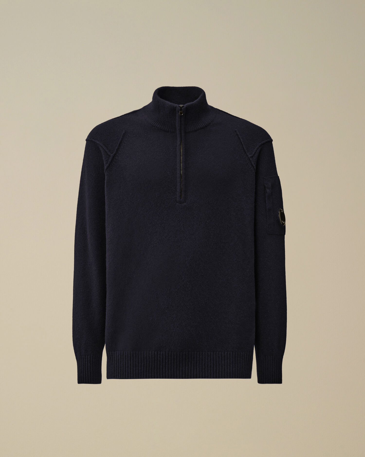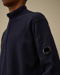 Half zip sweater crafted in Lambswool GRS. The Global Recycled Standard certifies the use of products in conformity with environmental and social criteria extended to all stages of the production chain. The knit features a ribbed neck, C.P. Company’s iconic Lens, contrast stitching, and ribbed cuffs and hem. Gauge 7. Regular fit. - Ribbed neck - Half zip fastening - Lens detail - Contrast stitching - Ribbed cuffs and hem - 7 Gauge knit - Regular fit CARE & COMPOSITION Care - Hand wash - Do not bleach - Do not tumble dry - Ironing maximum temperature 110°C - without steam - Dry cleaning in tetrachloroethene - mild process - Flat drip dry in the shade - Remove detachable accessories before washing - Dry inside out Composition - External fabric: 80% Wool, 20% Polyamide / Nylon SIZE & FITTING - Fits true to size, take your normal size - Model is 186 cm-6' 1" / 98-103 cm chest and is wearing a size L PRODUCT PASSPORT PRODUCT - Weaving: Italy - Dyeing: Italy - Confection: Moldova - Product contains at least 50% of recycled material PACKAGING - Minimum percentage of recycled materials 70%