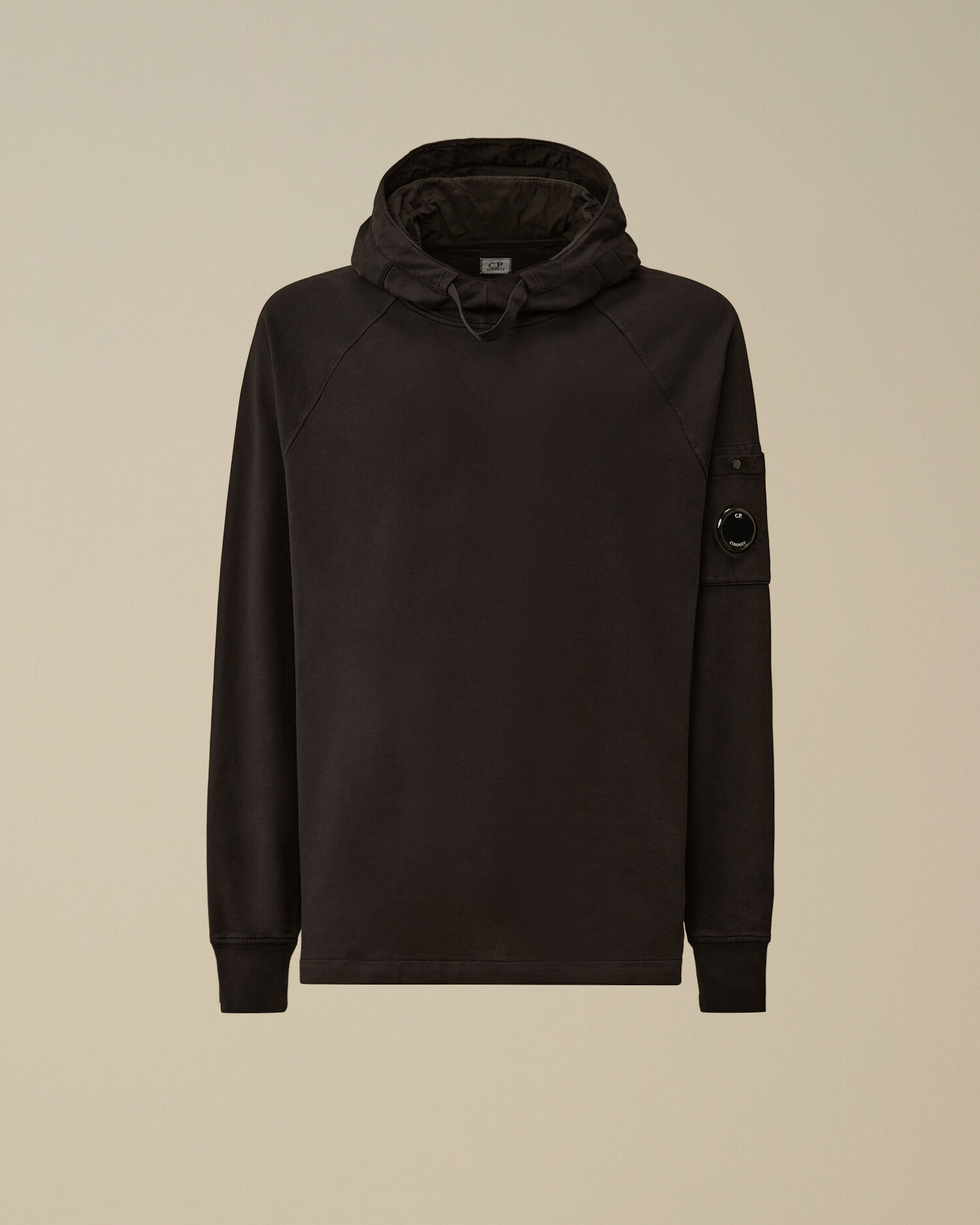 Hooded sweatshirt crafted in lightweight brushed fleece. The soft, breathable fabric ensures comfort and ease of movement. The sweatshirt features an adjustable hood with a front drawstring, C.P. Company’s iconic Lens, and ribbed cuffs. Finished with raglan sleeves and adjustable drawstring hem. Garment dyed. Regular fit. - Adjustable hood with front drawstring - Raglan sleeves - Lens detail - Ribbed cuffs - Adjustable drawstring hem - Garment dyed - Regular fit CARE & COMPOSITION Care - Wash max 30°C - Mild process - Do not bleach - Do not tumble dry - Ironing maximum temperature 110°C - without steam - Do not dry clean - Flat dry in the shade - Wash separately - Wash inside out - Iron inside out - Do not iron decorations - Remove detachable accessories before washing - Dry inside out - Do not expose the garment to direct sunlight or artificial light Composition - External fabric: 100% Cotton - Secondary fabric: 100% Cotton SIZE & FITTING - Fits true to size, take your normal size - Model is 186 cm-6' 1" / 98-103 cm chest and is wearing a size L PRODUCT PASSPORT PRODUCT - Weaving: Italy - Dyeing: Italy - Confection: Italy PACKAGING - Minimum percentage of recycled materials 70%