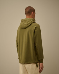 Hooded sweatshirt crafted in lightweight brushed fleece. The soft, breathable fabric ensures comfort and ease of movement. The sweatshirt features an adjustable hood with a front drawstring, C.P. Company’s iconic Lens, and ribbed cuffs. Finished with raglan sleeves and adjustable drawstring hem. Garment dyed. Regular fit. - Adjustable hood with front drawstring - Raglan sleeves - Lens detail - Ribbed cuffs - Adjustable drawstring hem - Garment dyed - Regular fit CARE & COMPOSITION Care - Wash max 30°C - Mild process - Do not bleach - Do not tumble dry - Ironing maximum temperature 110°C - without steam - Do not dry clean - Flat dry in the shade - Wash separately - Wash inside out - Iron inside out - Do not iron decorations - Remove detachable accessories before washing - Dry inside out - Do not expose the garment to direct sunlight or artificial light Composition - External fabric: 100% Cotton - Secondary fabric: 100% Cotton SIZE & FITTING - Fits true to size, take your normal size - Model is 186 cm-6' 1" / 98-103 cm chest and is wearing a size L PRODUCT PASSPORT PRODUCT - Weaving: Italy - Dyeing: Italy - Confection: Italy PACKAGING - Minimum percentage of recycled materials 70%