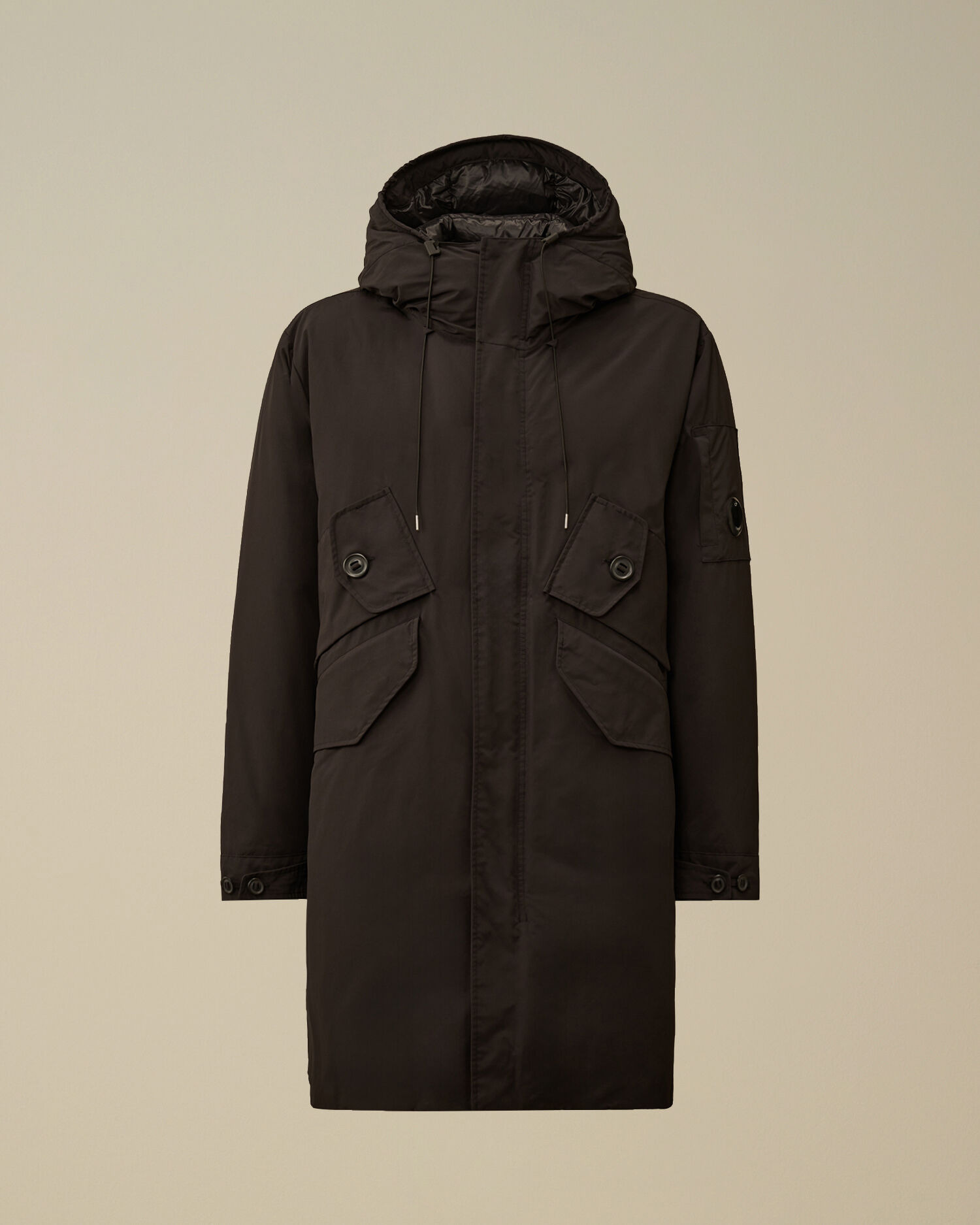 Long down jacket crafted in Micro-M (R), a multifilament barrier layer evolution of the 50 Fili. The cotton thread is replaced with a hydrophobic Polyester microfiber, while the nylon one is substituted with a recycled Polyester yarn. The jacket features an adjustable hood, hidden two-way full zip fastening with flap snap closure, and C.P. Company’s iconic Lens detail. Complete with chest patch button pockets, front flap snap pockets, inner zip pocket, and adjustable button cuffs. Water-resistant and breathable. Regular fit. - Adjustable hood - Hidden two-way full zip fastening with flap snap closure - Lens detail - Chest patch button pockets - Front flap snap pockets - Inner zip pocket - Adjustable button cuffs - Regular fit CARE & COMPOSITION Care - Wash max 30°C - Mild process - Do not bleach - Do not tumble dry - Ironing maximum temperature 110°C - without steam - Do not dry clean - Line dry - Wash separately - Remove detachable accessories before washing Composition - External fabric: 100% Polyester - Lining: 100% Polyamide / Nylon - Secondary lining: 100% Cotton - Padding (Feather): [234gr. - 90% ] 90% White duck down, 10% Feather SIZE & FITTING - Fits true to size, take your normal size - Model is 186 cm-6' 1" / 98-103 cm chest and is wearing a size L PRODUCT PASSPORT PRODUCT - Weaving: Japan - Dyeing: Japan - Confection: China - Product contains at least 50% of recycled material - Releases plastic microfibers into the environment during washing PACKAGING - Minimum percentage of recycled materials 70%