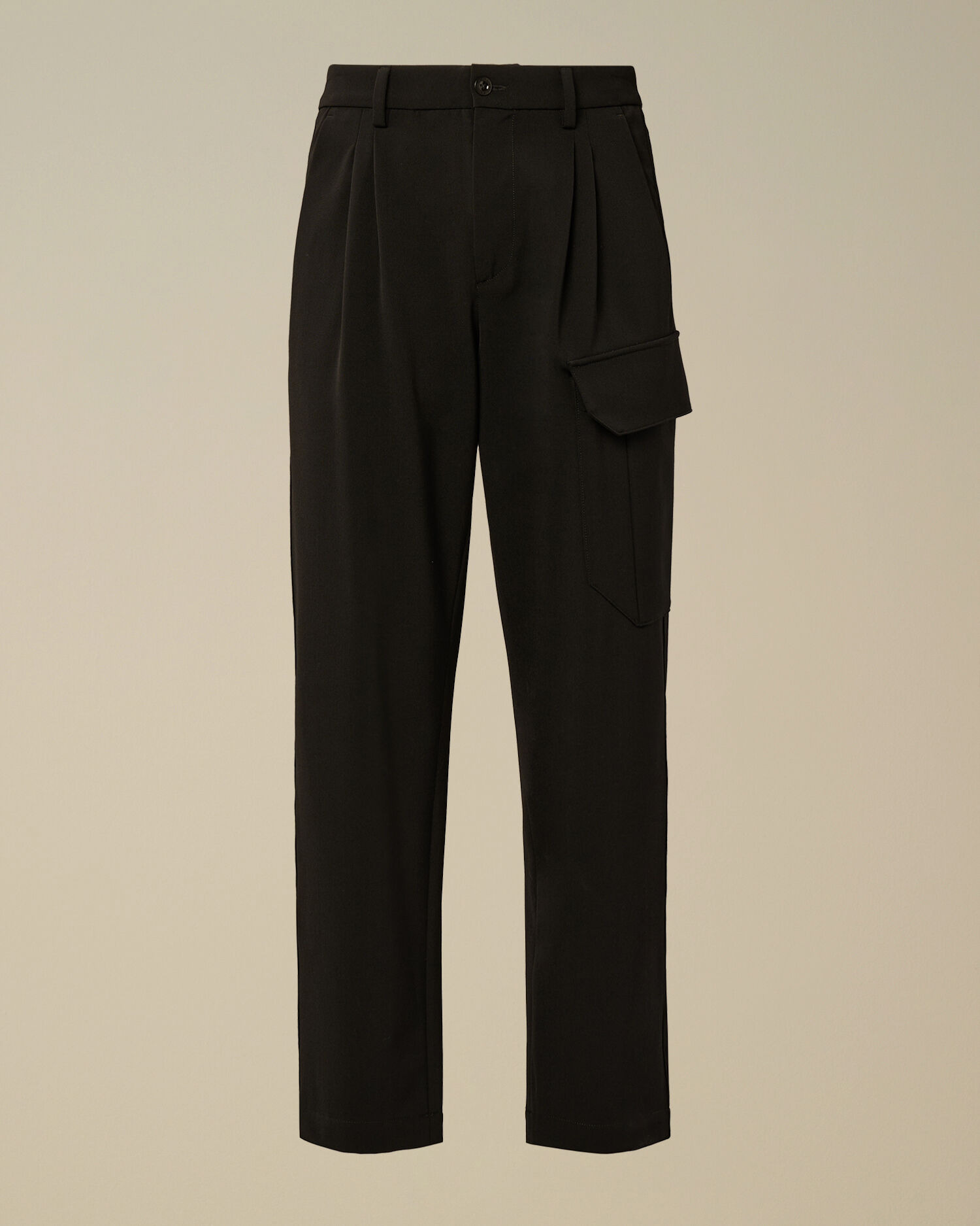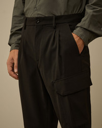 Cargo pants crafted in wool Gabardine. The pants feature button and zip fastening, belt loops, and pinces. Complete with side pockets and a cargo button pocket. Finished with back welt button pockets with an applied logo label. Loose fit. - Button and zip fastening - Belt loops - Pinces - Side pockets - Cargo button pocket - Back welt button pockets with applied logo label - Loose fit CARE & COMPOSITION Care - Wash max 30°C - Very mild process - Do not bleach - Do not tumble dry - Ironing maximum temperature 110°C - without steam - Do not dry clean - Line dry in the shade - Wash separately - Wash inside out - Do not twist or wring - Iron inside out Composition - External fabric: 53% Polyester, 42% Wool, 5% Elastane / Spandex SIZE & FITTING - Fits true to size, take your normal size - Model is 186 cm-6' 1"/ 88-91 cm waist and is wearing a size 48 PRODUCT PASSPORT PRODUCT - Weaving: Italy - Dyeing: Italy - Confection: Tunisia - Releases plastic microfibers into the environment during washing PACKAGING - Minimum percentage of recycled materials 70%