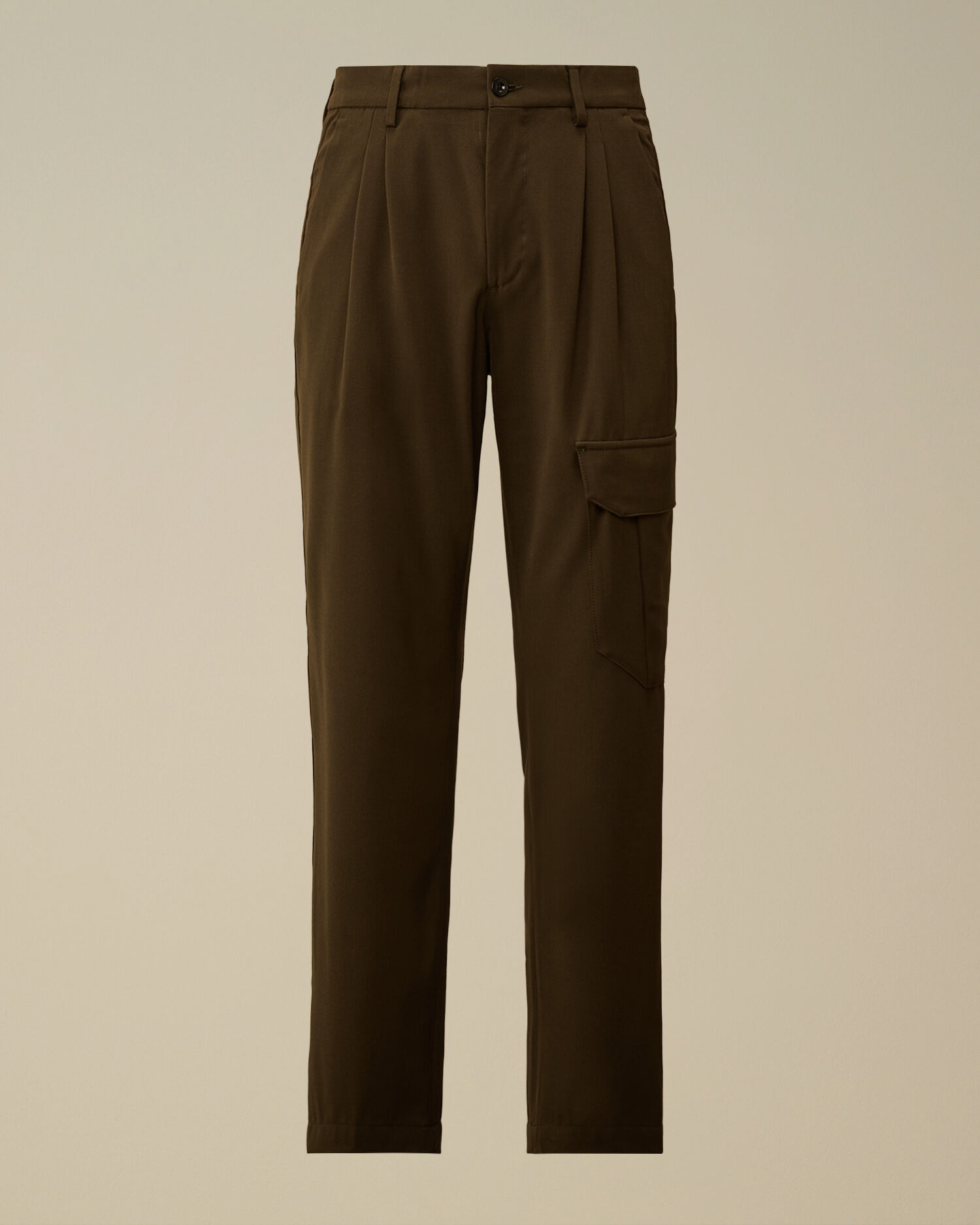 Cargo pants crafted in wool Gabardine. The pants feature button and zip fastening, belt loops, and pinces. Complete with side pockets and a cargo button pocket. Finished with back welt button pockets with an applied logo label. Loose fit. - Button and zip fastening - Belt loops - Pinces - Side pockets - Cargo button pocket - Back welt button pockets with applied logo label - Loose fit CARE & COMPOSITION Care - Wash max 30°C - Very mild process - Do not bleach - Do not tumble dry - Ironing maximum temperature 110°C - without steam - Do not dry clean - Line dry in the shade - Wash separately - Wash inside out - Do not twist or wring - Iron inside out Composition - External fabric: 53% Polyester, 42% Wool, 5% Elastane / Spandex SIZE & FITTING - Fits true to size, take your normal size - Model is 186 cm-6' 1"/ 88-91 cm waist and is wearing a size 48 PRODUCT PASSPORT PRODUCT - Weaving: Italy - Dyeing: Italy - Confection: Tunisia - Releases plastic microfibers into the environment during washing PACKAGING - Minimum percentage of recycled materials 70%