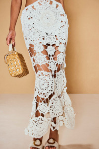 The Accalia Gown, now in Off-White, offers just the right amount of openness and coverage. This ankle-length, artistic gown is made from hand-crocheted geometric and floral patterns. Signature Cult Gaia cutouts at the waist only enhance the ultra-flattering effect of this dress and create an hourglass silhouette. The halter neckline ties behind the neck and is supported by two straps across the mid-back to hold you in. FIT NOTES Elastic waistband Adjustable neck tie COMPOSTION AND CARE 100% Polyester