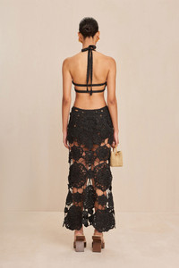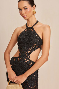 A hand-crocheted midi-length dress designed from geometric and floral patterns. — Signature Cult Gaia cutouts thoughtfully highlight the waist — Halter neckline — Two straps secure across mid-back FIT NOTES Elastic waistband Adjustable neck tie COMPOSTION AND CARE 100% Polyester
