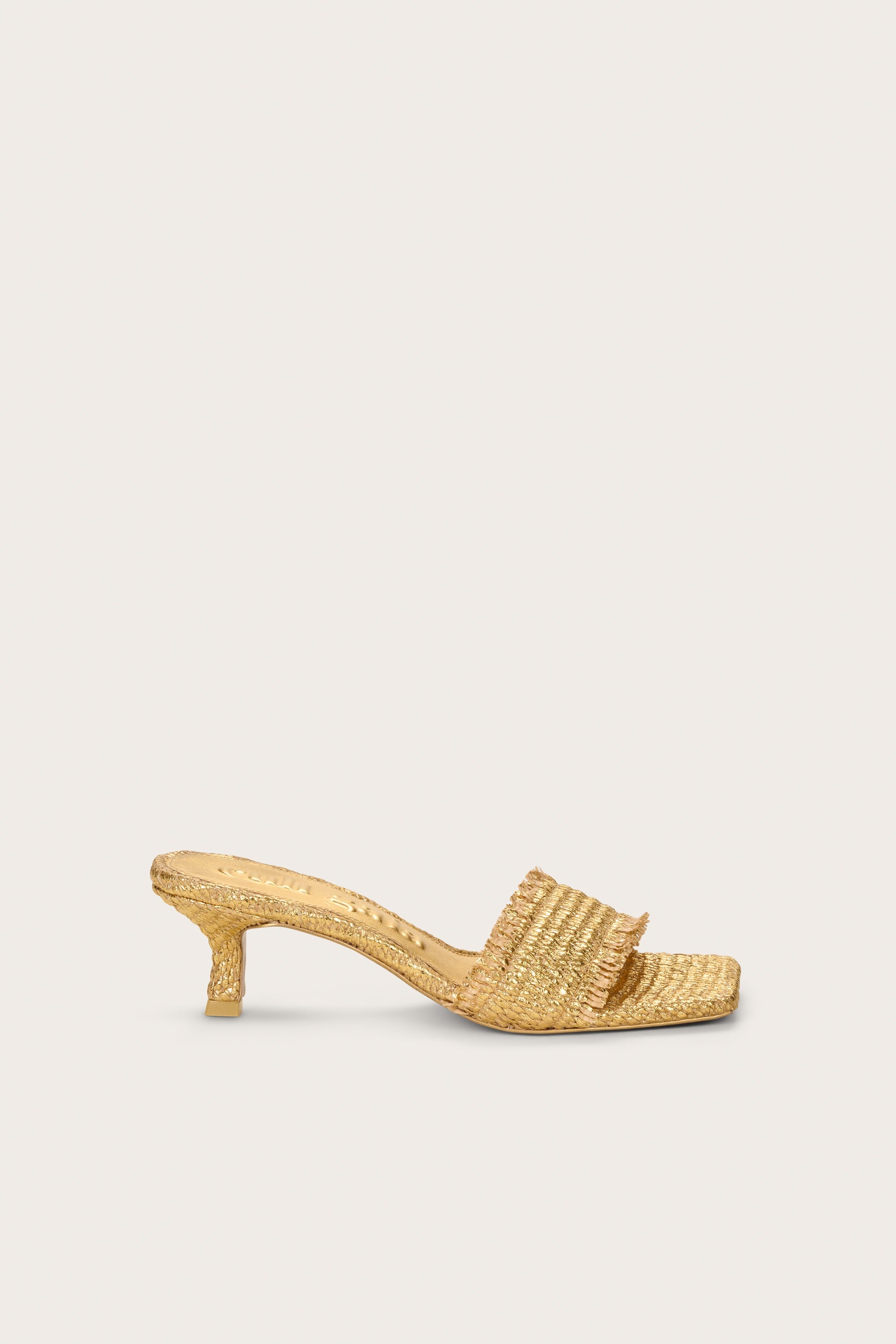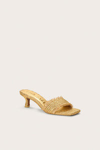 A square-toed open sandal in metallic knit straw with a curved kitten heel. — Metallic knit straw — Comma-heel — Rubber sole — Square toe — 2.36" heel height SIZE & FIT NOTES 60MM HEEL HEIGHT COMPOSITION AND CARE UPPER: 100% POLYETHYLENE, SOLE: 100% RUBBER, HEEL: 100% ABS WRAPPED IN POLYETHYLENE