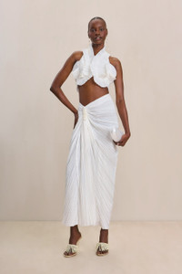 A sculptural plissé halter top with an open back and elastic band. — Symmetrical curved pleated satin — Halter-style — Open back — Wear with the Sonoma Skirt FIT NOTES Model is 5'10" and is wearing a size Small COMPOSTION AND CARE 100% POLYESTER