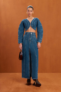 A long sleeve denim crop top with structured panels and a center bust held together by gold toned hardware. — Cropped length — Denim panels — Joined at bust by gold hardware — Wear with the Mia Jean Skirt for a complete set SIZE & FIT NOTES Model is 5'10" and is wearing a size Small COMPOSITION AND CARE 100% COTTON