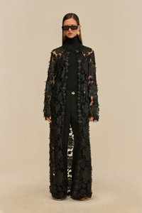 Preorder - Estimated Ship Date is Between November 21st and November 28th A sheer duster crafted out of glistening black lace. — Maxi length — Open front — Sheer — Black lace SIZE & FIT NOTES Model is 5'10" and wearing a size Small COMPOSITION AND CARE 100% NYLON Dry Clean Only