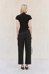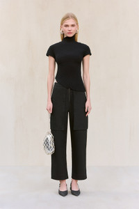 An asymmetrical short sleeve knit top with flattering radial stitch detailing. — Asymmetrical mock neck and hem — Stitch detailing throughout — Flared cap sleeves — Runs slightly large, if between sizes we recommend sizing down