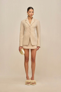 A classic blazer silhouette with a cinched waist, two buttons at the center and shoulder pads for exaggerated volume. — Shoulder pads — Cinched at waist — Side pockets — Wear as a set with the Cornelia Skirt SIZE & FIT NOTES Model is 5'10" and wearing a size 4 COMPOSITION AND CARE 100% VIRGIN WOOL