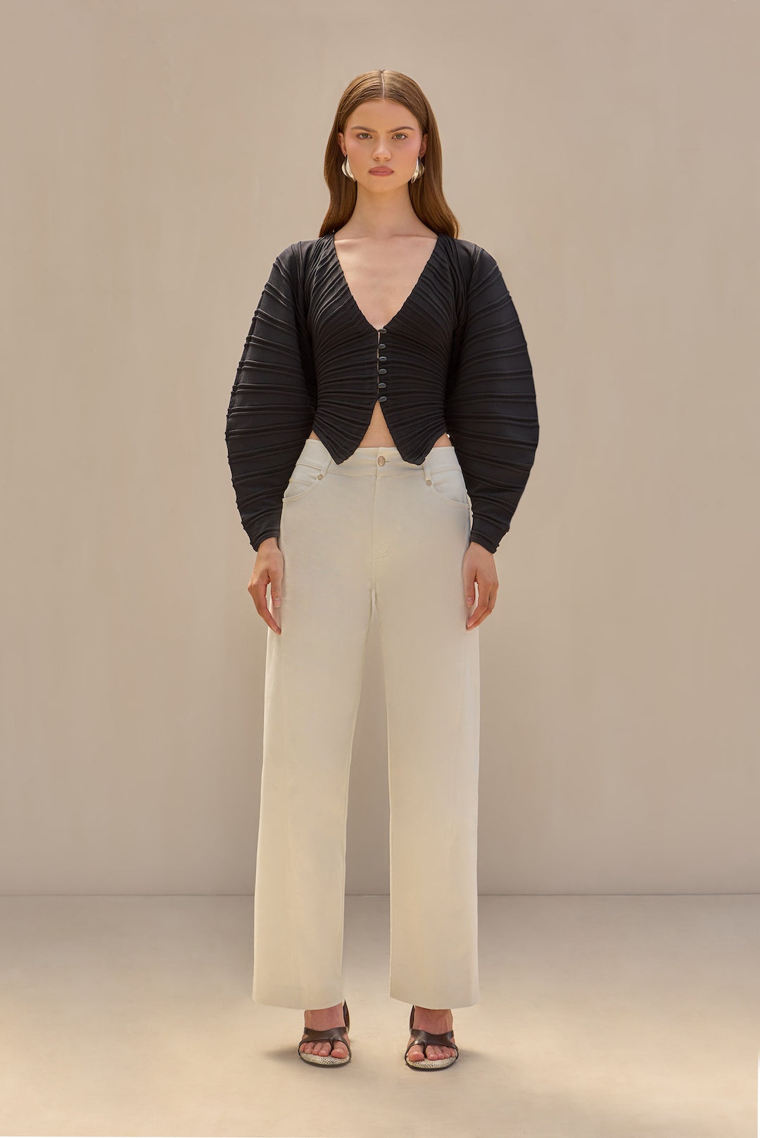 A structured, ribbed knit cardigan with an angular hem and stone buttons. — Can be worn open or closed — Oversized voluminous sleeves — Stone buttons — Adjustable sleeves FIT NOTES Model is 5'11" and is wearing a size Small COMPOSTION AND CARE 65% VISCOSE 35% NYLON
