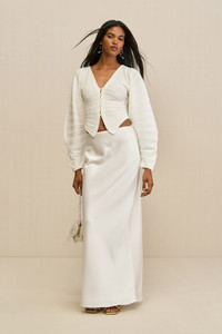 A structured, ribbed knit cardigan with an angular hem and stone buttons. — Can be worn open or closed — Oversized voluminous sleeves — Stone buttons — Adjustable sleeves SIZE & FIT NOTES Model is 5'10" and wearing a size Small COMPOSITION AND CARE 65% VISCOSE 35% NYLON