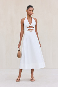 A midi-length version of everyone's favorite halter dress with adjustable, textured shiny brass buckles. — Midi length — Textured, gold-toned, brass hardware — Adjustable halter strap — Back center zipper — Lined