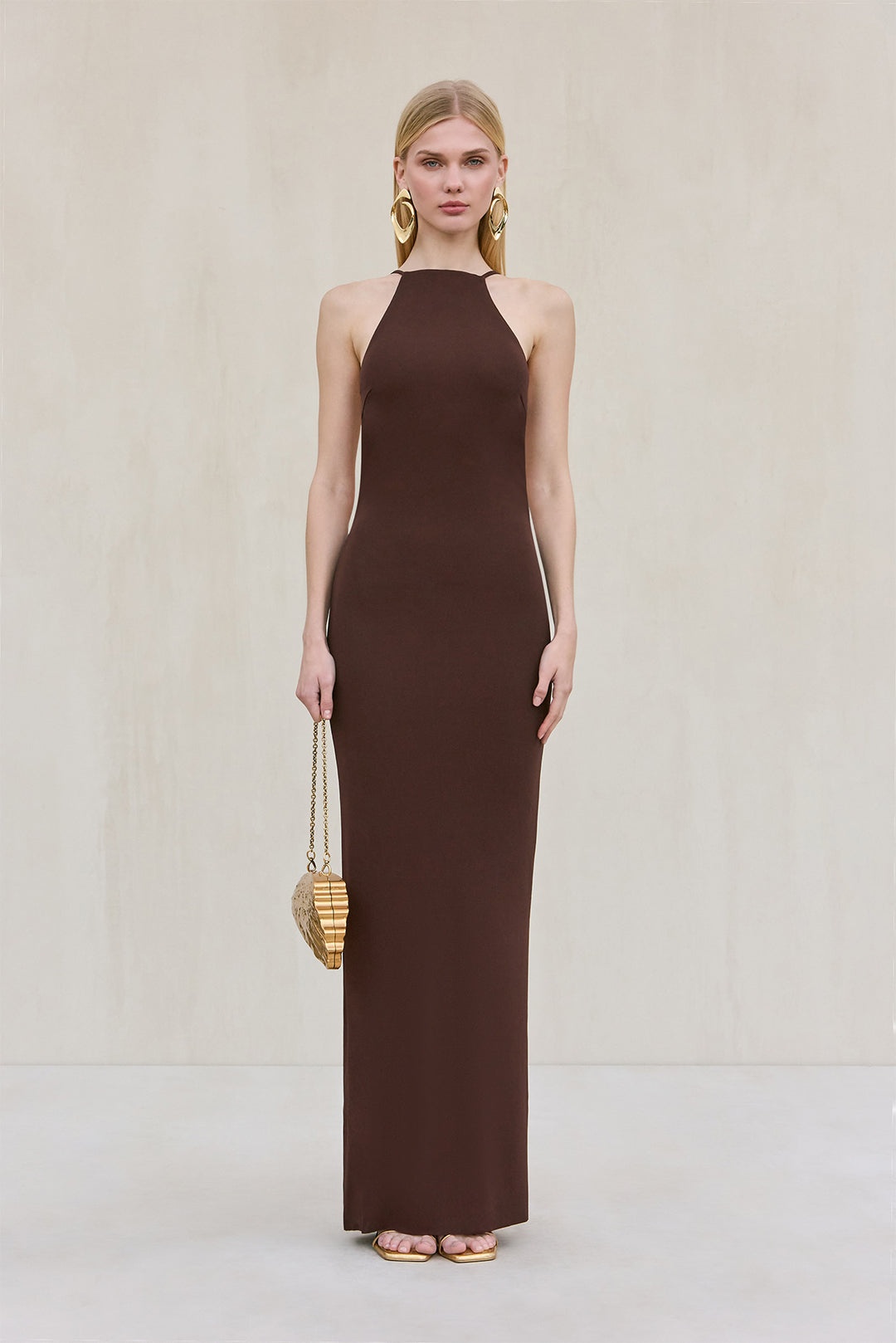 A sleek matte viscose jersey maxi dress with a halter neckline and removable gold butterfly hardware detail. — Maxi length — Matte viscose jersey — removable gold butterfly hardware — Center back zipper — Back slit