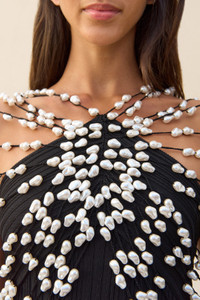A midi-length ribbed knit dress with organically shaped faux pearl details. Intentionally designed and delicately made, please try on with care. Limited quantities available. — Classic column silhouette — Faux pearl detailing — Draped shoulder embellishments — Objet d'art SIZE & FIT NOTES Model is 5'10" and is wearing a size Small Runs small, we recommend sizing up Length 45" Maxi dress Organically shaped faux pearl neck details COMPOSITION AND CARE 100% Bright Rayon