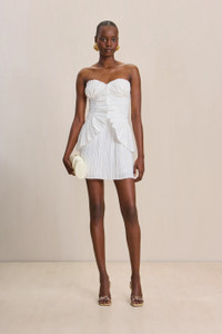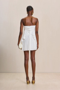 A pleated satin, strapless mini-dress with layered hip detail. — Inner corset — Center back zipper — Fitted side paneling for a flattering silhouette — Mini length — Runs small, we recommend sizing up SIZE & FIT NOTES Model is 5'10" and is wearing a size 4 Runs Small — We recommend sizing up COMPOSITION AND CARE 100% POLYESTER