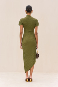 An asymmetrical mock neck short sleeve knit dress with flattering radial stitch detailing. — Asymmetrical mock neck and hem — Stitch detailing throughout — Flared cap sleeves — Midi length — Runs slightly large, if between sizes we recommend sizing down SIZE & FIT NOTES Model is 5'10" and is wearing a size Small Runs slightly large, if between sizes we recommend sizing down COMPOSITION AND CARE 100% COTTON