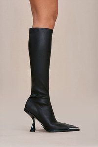 A knee high pointed toe leather boot with a silver toe cap and comma heel. — Fitted calf — Comma heel — Pointed toe with cap — 4.13" heel height — For initial try on, we recommend wearing a thin dress sock SIZE & FIT NOTES 105MM HEEL HEIGHT For initial try on, we recommend wearing a thin dress sock. COMPOSITION AND CARE UPPER: 100% LAMB OUTSOLE: 100% TUNIT HEEL: 100% ABS Gently wipe leather with a soft, dry or slightly damp cloth to remove dirt and dust. For deeper cleaning, use a leather-specific cleaner with a soft cloth. Do not use water or household cleaners.