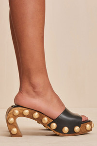A sculptural mule designed with a curved wood frame, smooth leather straps and textured brushed brass studs. - Smooth nappa leather straps and sole - Moire textured brushed brass studs SIZE & FIT NOTES Heel Height: 3" COMPOSITION AND CARE Upper: 100% Cow Leather Sole: 100% Rubber Heel: 100% Wood