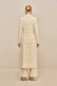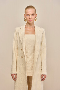 An eyelash jacquard long coat with a back slit and button closure. — Double breasted — Eyelash jacquard fabric — Back slit — Full length SIZE & FIT NOTES Model is 5'11" and is wearing a size 4 COMPOSITION AND CARE 68% COTTON 18% POLYESTER 8% VISCOSE 5% WOOL 1% ELASTANE
