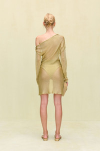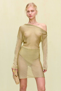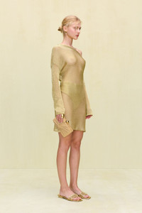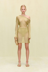 A high rise bikini bottom crafted in a gold knit yarn. — High rise — Gold knit yarn — Moderate coverage — Wear with Alia Bikini Top SIZE & FIT NOTES Model is 5'10" and wearing a size Small COMPOSITION AND CARE 60% VISCOSE 40% POLYETHYLENE TEREPHTHALATE