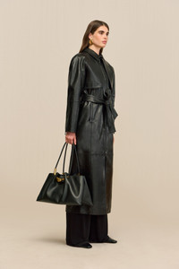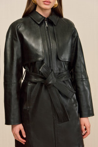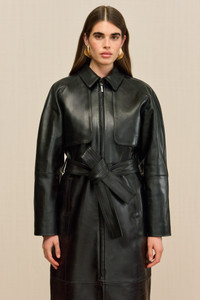 An ankle length coat crafted out of smooth leather, featuring functional pockets and an adjustable tie at the waist. — Leather — Ankle length — Functional pockets — Front zipper — Adjustable waist tie SIZE & FIT NOTES Model is 5'10" and wearing a size Small COMPOSITION AND CARE 100% LAMB LEATHER