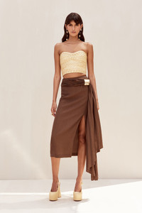 The Jacira Top is a flaxen-hued raffia bustier. This sculptural form is woven in a sculptural bust shape and is lined for comfortable wear. Featuring a central back zipper, this artful cropped piece can stand on its own as an objet, yet fits seamlessly to your body. SIZE & FIT NOTES Runs small — we recommend sizing up COMPOSITION AND CARE 100% Straw Lining 100% Polyester