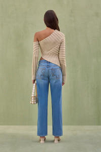 A long sleeve tape yarn top with asymmetrical neckline and hem. — Full length — Exposed left shoulder — Tape yarn — Stitch detailing