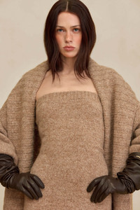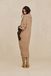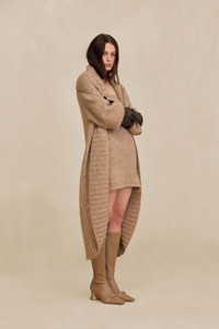 A cocoon style duster cardigan with a ribbed shawl collar and longline hem that acts as the ultimate layering piece. — Midi length — Wool and Alpaca blend yarn — Open design with no closure — Ribbed details — Wear with the Holland Knit Dress SIZE & FIT NOTES Model is 5'10" and is wearing a size Small COMPOSITION AND CARE 53% WOOL 17% ALPACA 30% POLYAMIDE