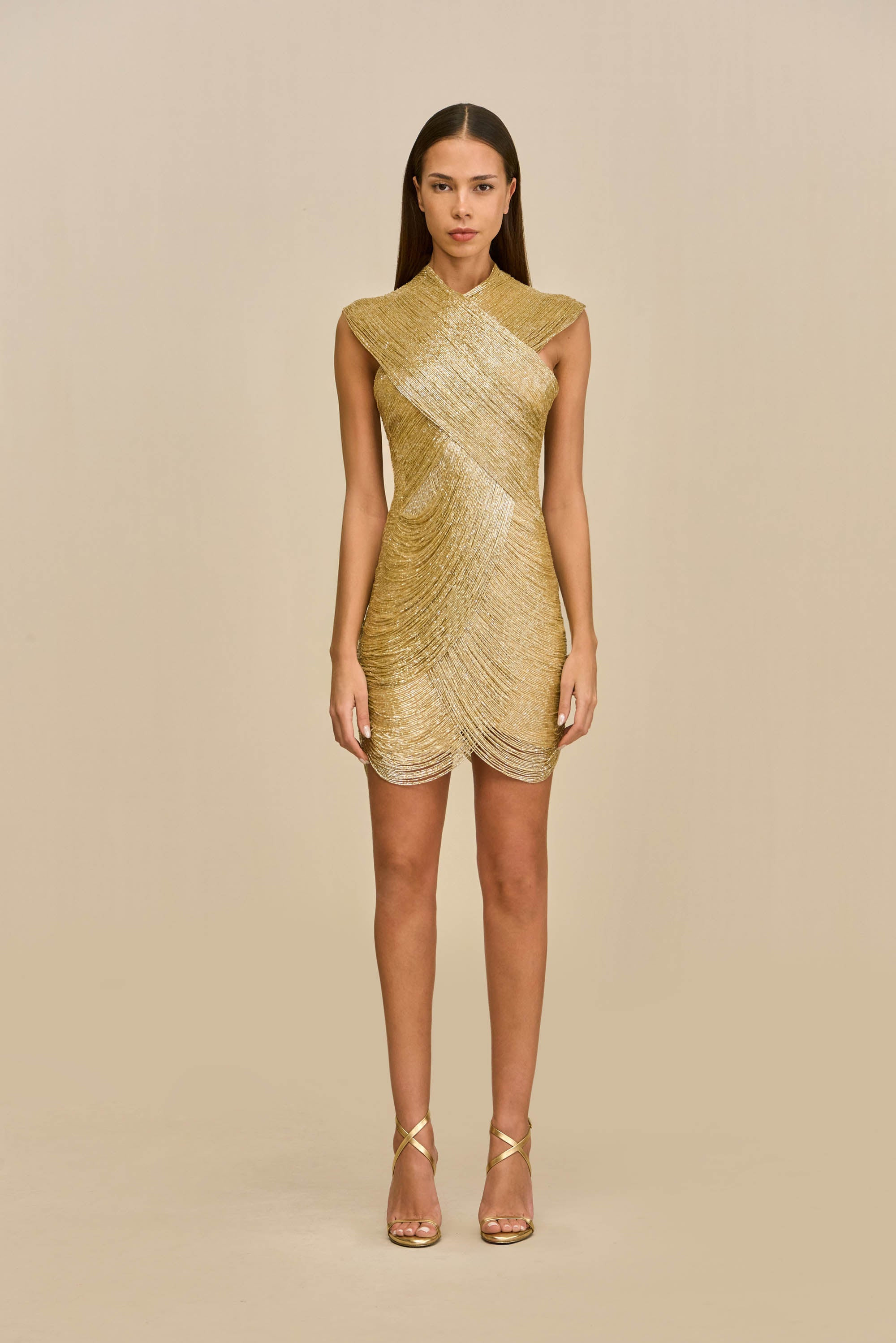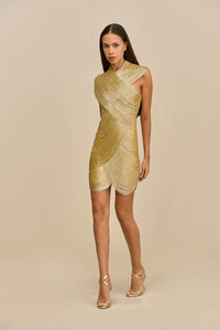 Preorder - Estimated Ship Date is Between November 17th and November 24th A breathtaking mini dress featuring golden layers of beaded fringe that cascade over the body. — Mini length — Hand beaded — Mock neck — Draped fringe across body — Center back zipper SIZE & FIT NOTES Model is 5'10" and wearing a size 4 COMPOSITION AND CARE 100% GLASS BEADS SPOT CLEAN ONLY