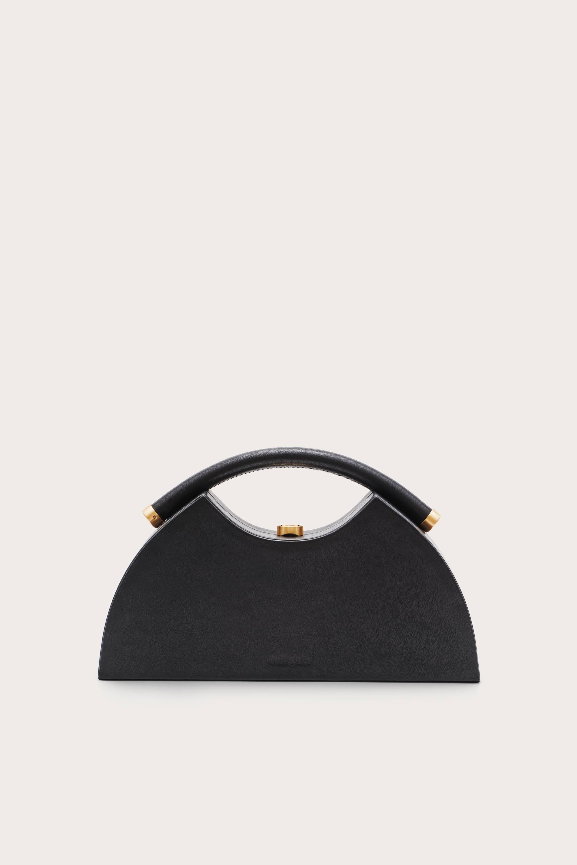 A smooth leather clutch resembling an arch with a functional top handle and golden hardware. — Black leather — Top closure — Gold toned hardware — Top handle silhouette — Can fit an iPhone SIZE & FIT NOTES 1.97" W x 5.51" H x 11.2" COMPOSITION AND CARE 100% SHEEP LEATHER; LINING:100% COTTON Wipe with a soft cloth to remove dust. Use a leather cleaner for deep cleaning. Apply leather protector spray to prevent water and stains.