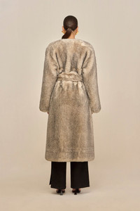 A sumptuous long sleeve faux fur coat with adjustable waist tie. — Faux fur — Collarless — Long sleeve — Waist tie SIZE & FIT NOTES Model is 5'11" and is wearing a size Small COMPOSITION AND CARE 100% FAUX FUR POLYESTER