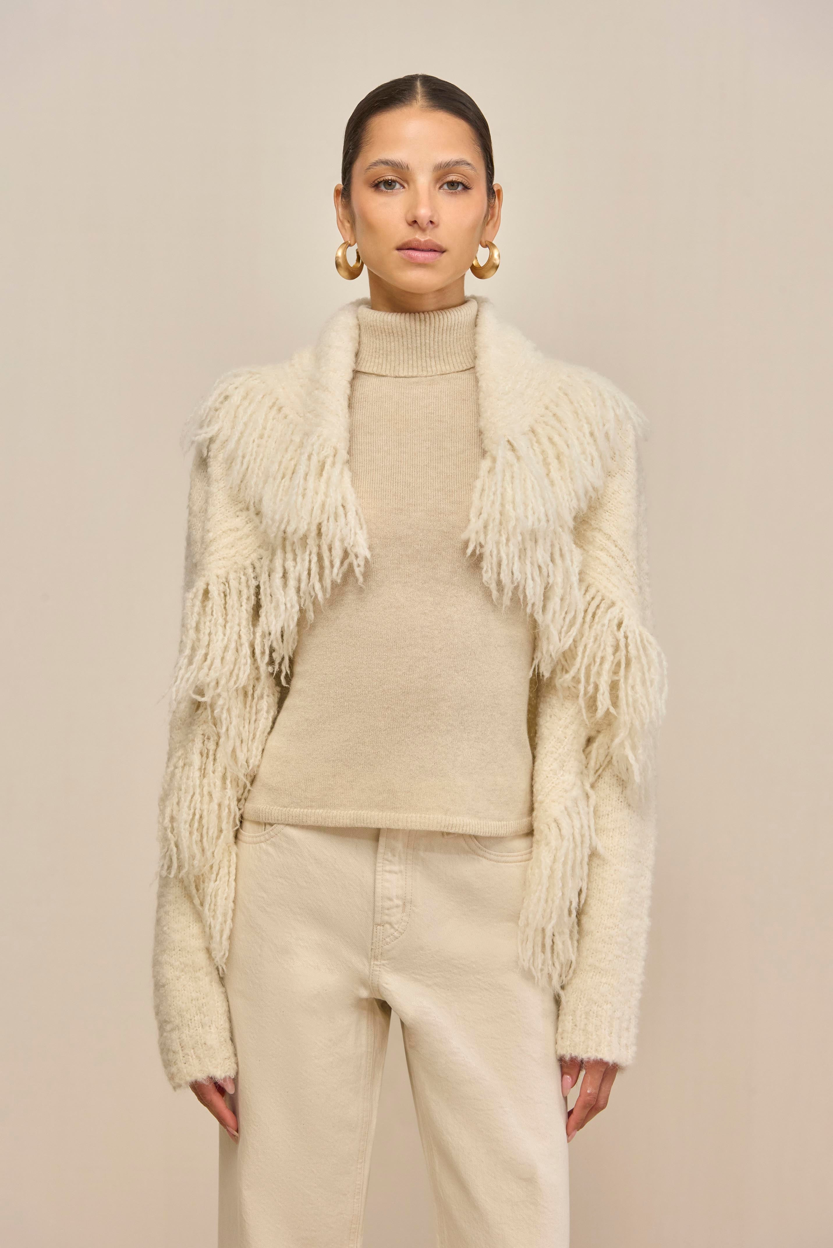 A plush wool alpaca blend cardigan with a cascading fringed hem. — Wool alpaca blend — Cascading hem — Stretch knit — Fringe details — Button front closure SIZE & FIT NOTES Model is 5'10" and wearing a size Small COMPOSITION AND CARE 39% RWS WOOL, 22% ALPACA, 25% ACRYLIC, 13% RECYCLED NYLON, 1% SPANDEX