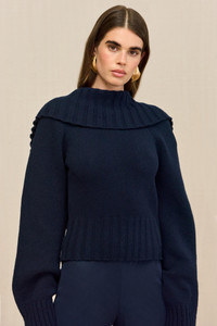 A lush sweater with a unique mock neckline and a dramatic cowl back. — Draped cowl back — High neck — Slight flare sleeves — Merino wool blend SIZE & FIT NOTES Model is 5'10" and wearing a size Small COMPOSITION AND CARE 55% MERINO WOOL 20% COTTON 25% NYLON